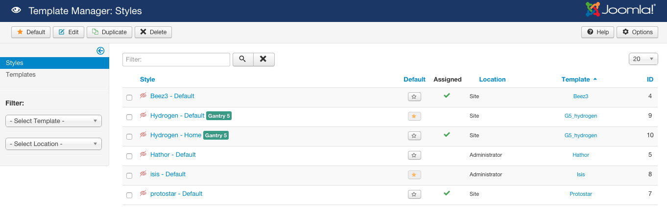 Si estás usando la plantilla Gantry, querrás configurarla como la plantilla predeterminada para que se cargue en el front end. Ve a Extensiones → Gestor de Plantillas, selecciona la casilla gantry y haz clic en Predeterminado en la barra de herramientas de botones.